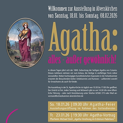 Der Verein „Freunde der Schatzkammer St. Agatha Alverskirchen e.V.“ lädt ein zu einer besonderen Ausstellung anlässlich des 1800. Geburtstages der Heiligen Agatha von Catania unter dem Motto: AGATHA: ALLES – AUSSER GEWÖHNLICH! von Sonntag, 18.01. bis Sonntag, 08.02.2026.