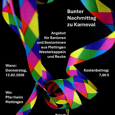 Die Kolpingsfamilie Mettingen und der Sachausschuss Senioren laden Senioren und Seniorinnen aus Mettingen, Westerkappeln und Recke ein zu einem bunten Nachmittag im Pfarrheim Mettingen am Donnerstag, 12. Februar um 15 Uhr. Anmeldung im Pfarrbüro Mettingen bis zum 6. Februar.