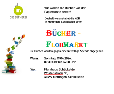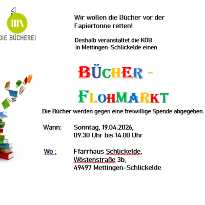 Die Katholische Öffentliche Bücherei (KÖB) Mettingen-Schlickelde lädt am Sonntag, 19. April, von 9.30 bis 14.00 Uhr herzlich zu einem Bücherflohmarkt ins Pfarrhaus Schlickelde ein. Das Büchereiteam möchte gut erhaltene Bücher vor der Entsorgung bewahren und bietet sie gegen eine freiwillige Spende an. Kommen Sie vorbei, stöbern Sie in Ruhe und entdecken Sie neuen Lesestoff!