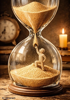 Irgendwann wird der Zeigefinger des Mannes an der Sanduhr ermüden. Es hilft nichts: Wir müssen uns unserer Endlichkeit, unserer Vergänglichkeit stellen. Wir müssen akzeptieren, dass der Vorrat unserer Minuten, Stunden und Jahre begrenzt ist.