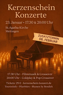 Am Freitag, 23. Januar finden in der St.-Agatha-Kirche Mettingen zwei besondere Kerzenschein-Konzerte statt. Der Kirchraum wird an diesem Abend in ein warmes Kerzenmeer getaucht und lädt dazu ein, zur Ruhe zu kommen, innezuhalten und die Kraft der Musik zu erleben.