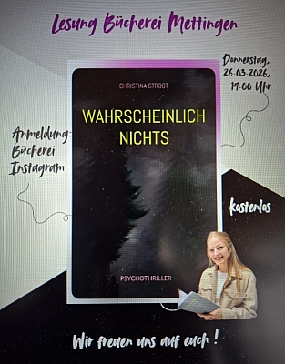 Das Team der Katholischen Öffentlichen Bücherei Mettingen lädt erneut zu einer Lesung in die Bücherei ein. Zu Gast ist die junge Autorin Christina Stroot aus Riesenbeck.