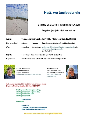 Diese Suchrichtung verfolgen auch die diesjährigen Online-Exerzitien. Mit täglichen Impulsen per Mail während der gesamten Fastenzeit bieten sie eine Möglichkeit der Selbstvergewisserung. Schon kleine, achtsame Unterbrechungen schaffen Abstand zur Routine des Alltages und eröffnen neue Sichtweisen auf das eigene Tun und Leben.