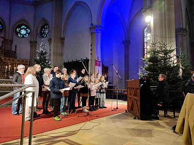 Bereits zum 13. Mal hatte der Sachausschuss Familie zum ökumenischen Singen eingeladen. In vielfältigen Variationen wurde der Gesang von Schola, Kinderkantorei und Gemeinde vom Posaunenchor der evangelischen Kirchengemeinde unter der Leitung von Erich Kempka sowie von befreundeten Musikern und Musikerinnen des Laggenbecker Posaunenchores begleitet.