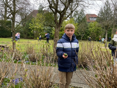 Im Anschluss fand die 1. Ostereiersuche im Garten des Pfarrhauses statt. Über 100 Kinder machten sich etappenweise mit Geschwistern und Eltern auf die Suche nach den bunten Eiern. Ausgangs- und Zielpunkt war ein 1,20 Meter großes Überraschungsei aus Pappmaschee, das Conny Buß aus Heiden gestaltet hat und das den Pfarrhausgarten zierte.