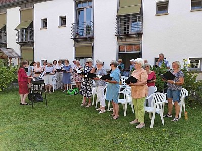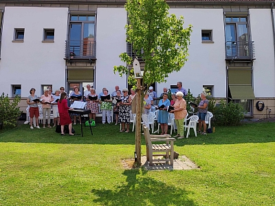 „Mettingen, mien Heimatdüöpken, wat liggs du doch wunderboar…“ klang es am Sonntagvormittag im Innenhof des Altenheimes ‚Maria Frieden‘. Der Kirchenchor St. Agatha unter der Leitung von Kirchenmusikerin Melanie Ortmann hatte sich bei tropischen Temperaturen im Schatten des Gebäudes eingefunden, um den Bewohnern mit altbekannten Liedern eine Freude zu bereiten.