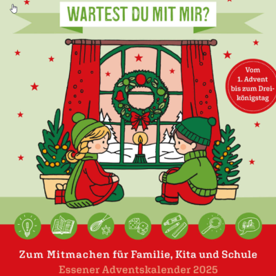 Der Essener Adventskalender 2025 für Kinder, Familien, Kitas und Grundschulen ist wieder am Schriftenstand in der Kirche St. Mariä-Himmelfahrt, in beiden Pfarrbüros und in den Pfarrbüchereien zum Preis von 4,00 Euro erhältlich. Darin finden sich viele Rezepte, Lieder sowie Spiel- und Bastelideen, um die Zeit der Vorfreude auf Weihnachten zu gestalten und gemeinsam zu feiern.