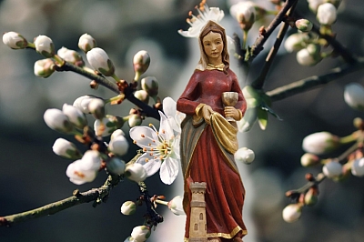 Bedeutung der Barbara-Zweige: Als Barbara in den Kerker gezerrt wurde, verfing sich ein Kirschenzweig in ihrem Kleid. Mit etwas Wasser aus ihrer Trinkschale habe die spätere Heilige ihn benetzt und am Tage ihrer Hinrichtung öffneten sich die Blüten, so die Sage. Deshalb werden diese Zweige Barbarazweige genannt.