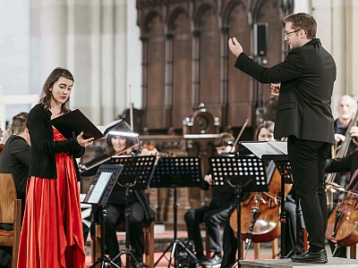 Apropos Paukenschlag: Die bemerkenswerte Orgel von St. Agatha hatte gerade die ersten Pleno-Akkorde in den großen Kirchenraum geworfen, da ertönte das Grundmotiv der Pauken, gestimmt auf die anführenden Töne „g“ und „b“. In sieben Teilen entspannen sich Dialoge zwischen der versierten Organistin Anastasiia Yurchenko, die manche Passagen gar zehnstimmig (!) zu bewältigen hatte, und der von dem Mettinger Chorleiter und Organisten Artur Jurczyk geleiteten Camerata Osnabrück.